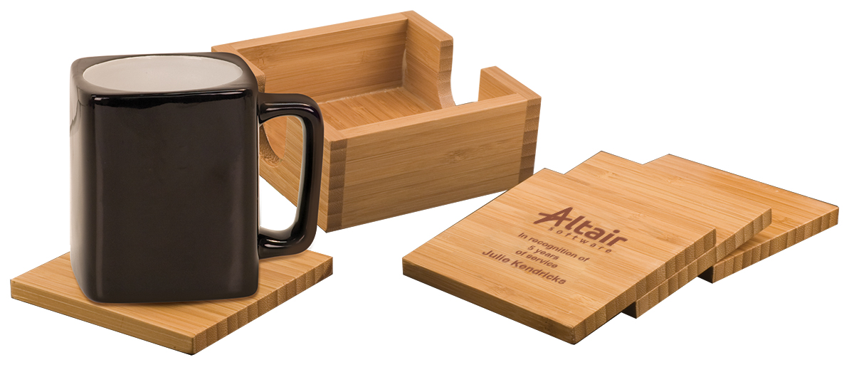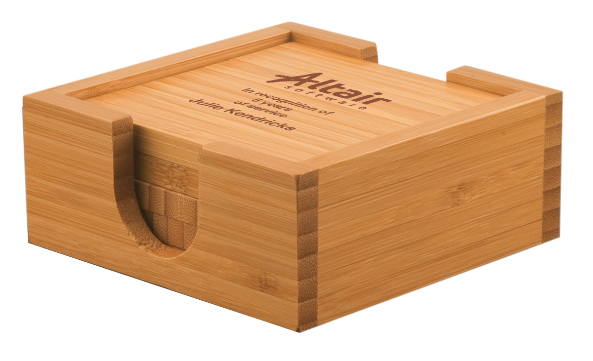 This five piece coaster set includes four bamboo coasters and a bamboo caddy for storage. Each coaster comes with 4 felt pads on the bottom to prevent surface scratches.