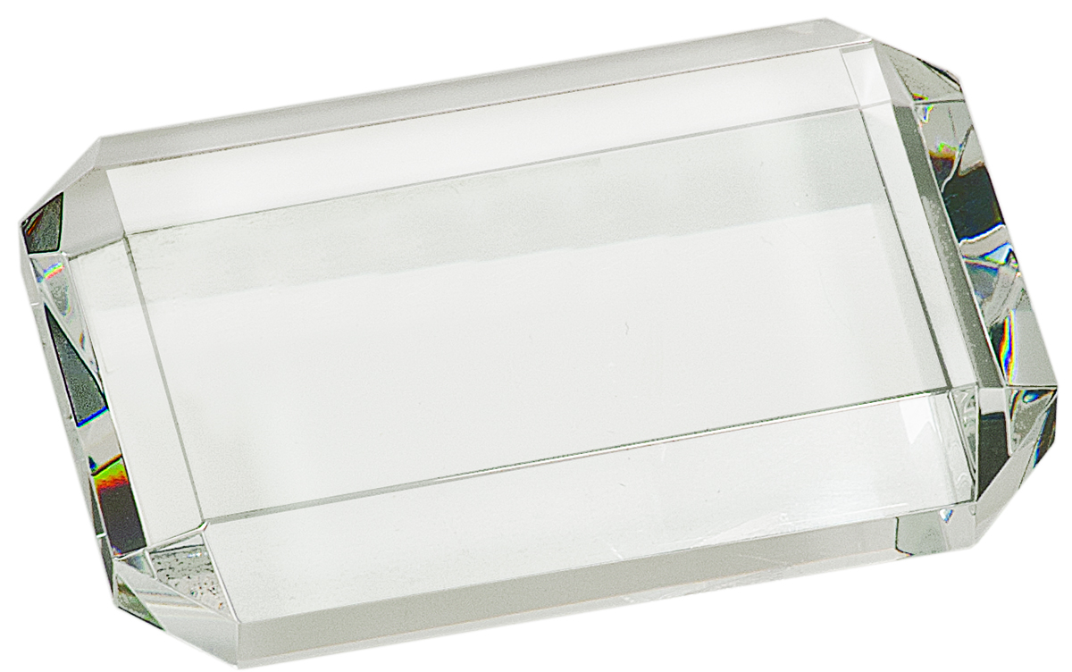 4" x 2 3/4" Our Premier Crystal Paperweights is handmade and may vary slightly in size. Optic crystal rectangle paperweight with clipped corners. Packaged individually in a lined gift box. Premier Crystal is the ultimate way to recognize and honor!