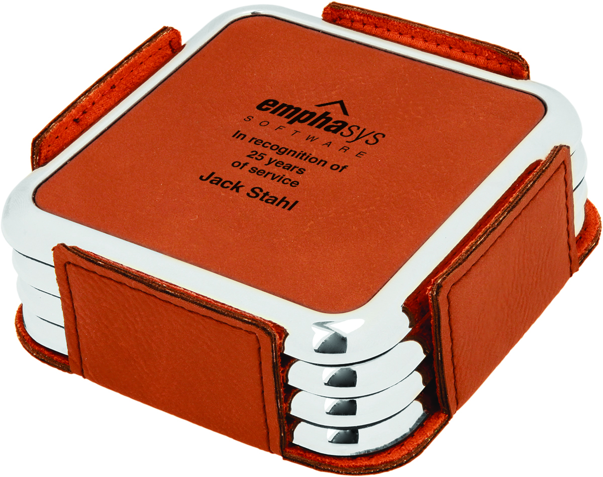 3 5/8" x 3 5/8" Laserable Leatherette offers the look and feel of genuine leather at a fraction of the price. This richly textured, synthetic material is water resistant, easy to clean and durable enough for the rigors of daily use. The high quality workmanship of each leatherette piece is sure to impress every recipient with its elegant individuality.